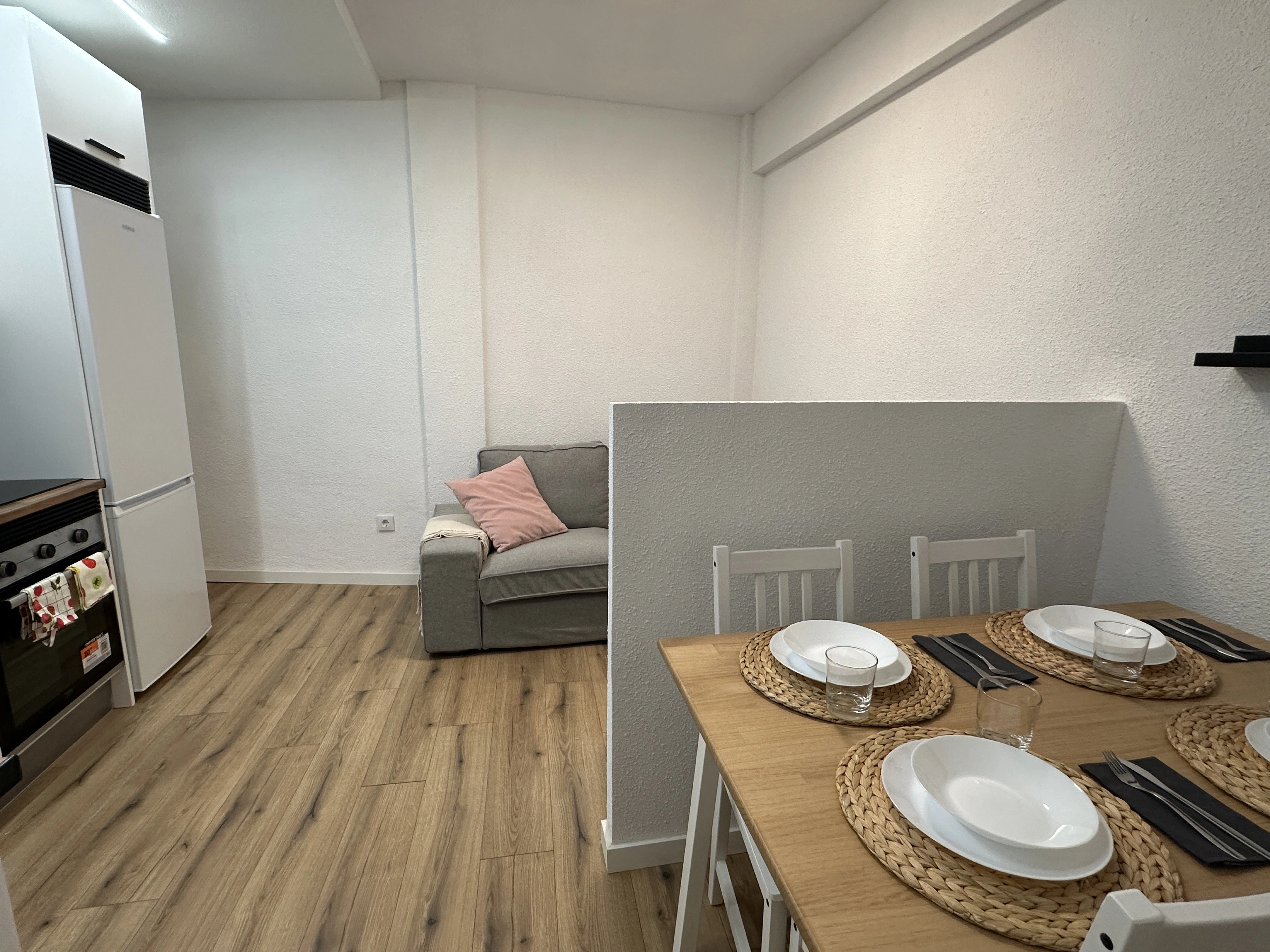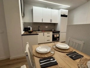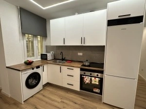 The property features a spacious open-plan living, dining, and kitchen area, designed for socializing, relaxing, and everyday living. The living room includes a sofa, TV, and a dining table for 4 people, perfect for meals, studying, or spending time together. The kitchen is fully equipped with a refrigerator, oven, microwave, ceramic hob, storage cabinets, and all the kitchen utensils you need to move in and start living comfortably.