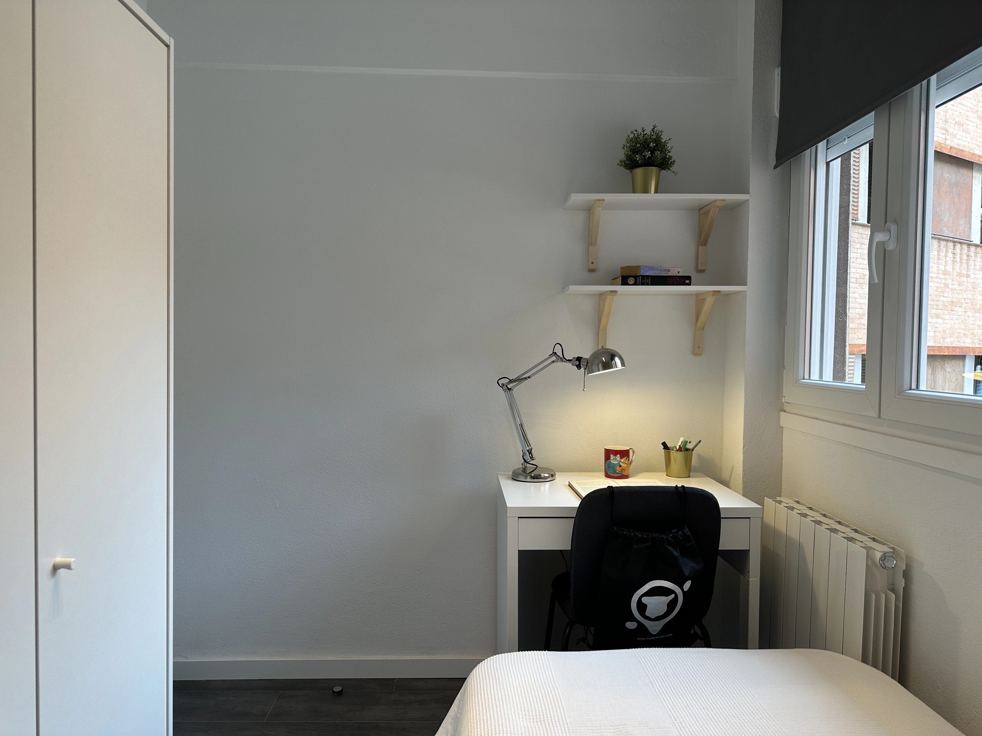 comfortable bed whenever you need some time to yourself. The room is easily kept clean because of the large wardrobe. The wardrobe keeps your clothes and other items organized and keeps the room tidy. The windows next to the desk make the room bright which makes for a productive environment ideal for student life.
