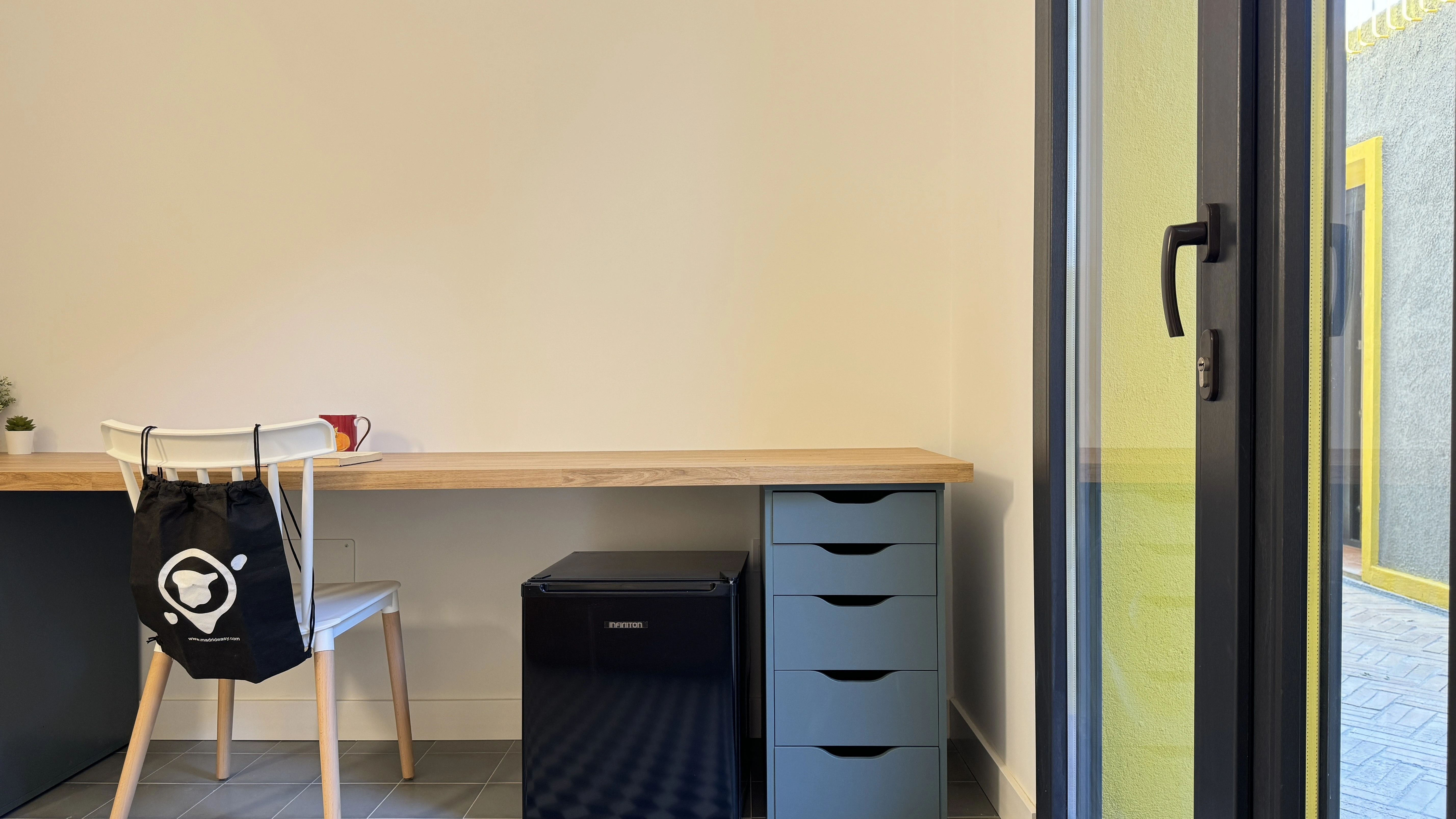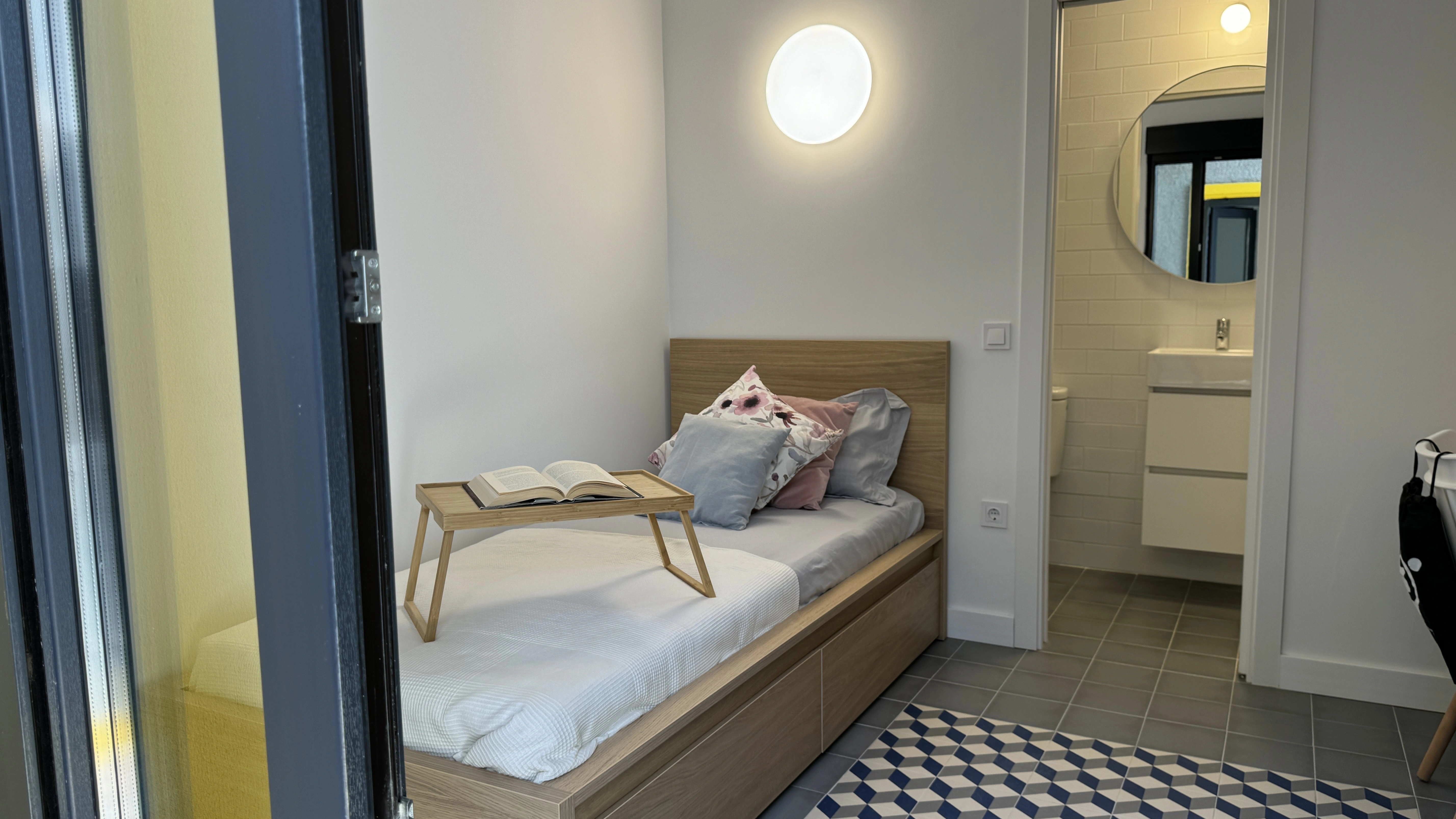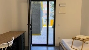 • Habitación 19: La más amplia, con 15,2 m² de espacio y una terraza privada de 15,6 m². Ideal para quienes buscan mayor amplitud. Equipamiento: camasillamesa grandefrigorífico pequeño y armario.