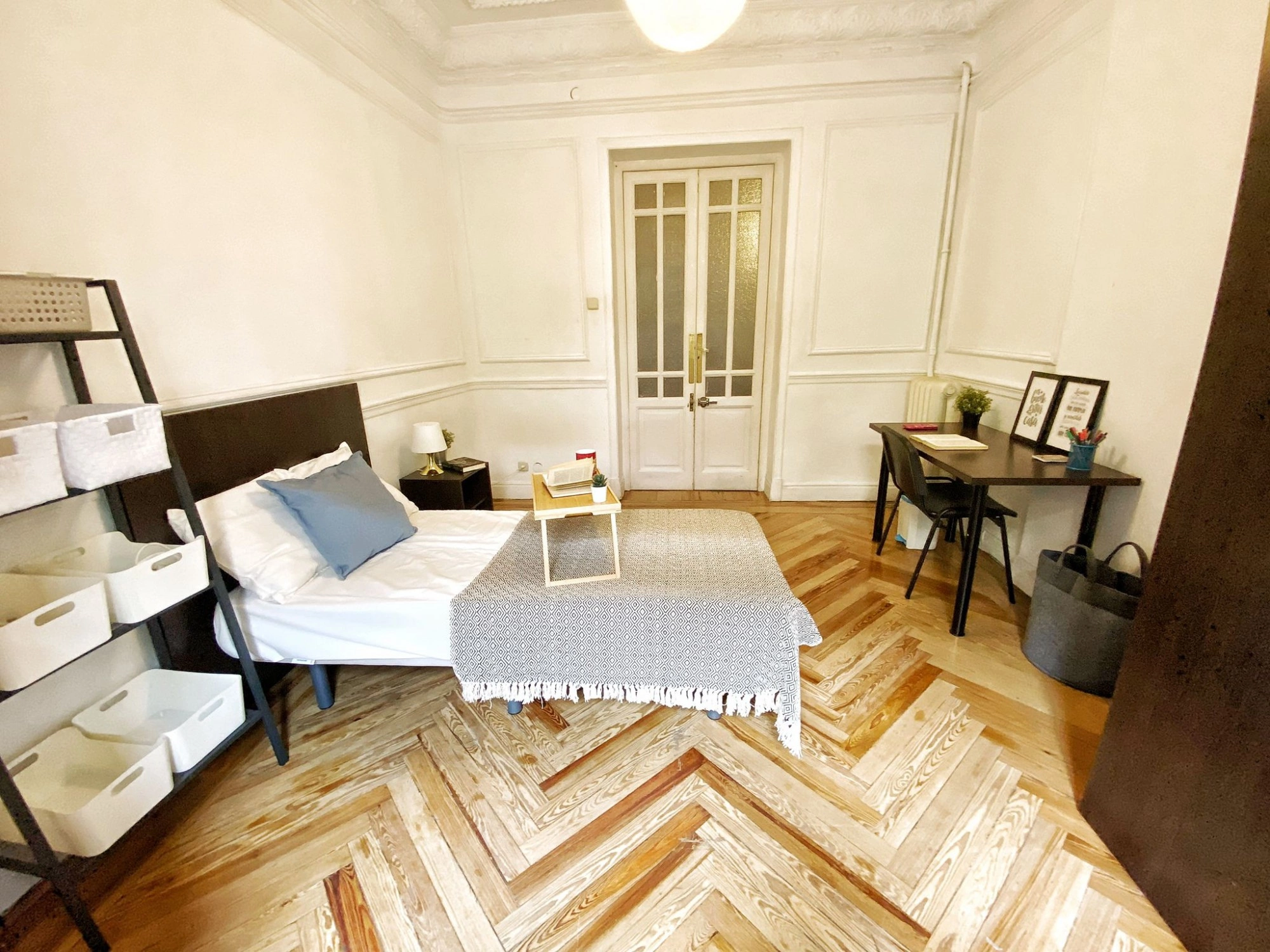 Esta espectacular habitación en alquiler cerca del centro de Madrid tiene una vista exterior, y se encuentra en frente de la sala de estar y al lado de la puerta de entrada. La habitación tiene una cama, escritorio y silla muy cómodos y espaciosos. La habitación también tiene un gran armario y la luz natural que dejan pasar las ventanas es increíble.