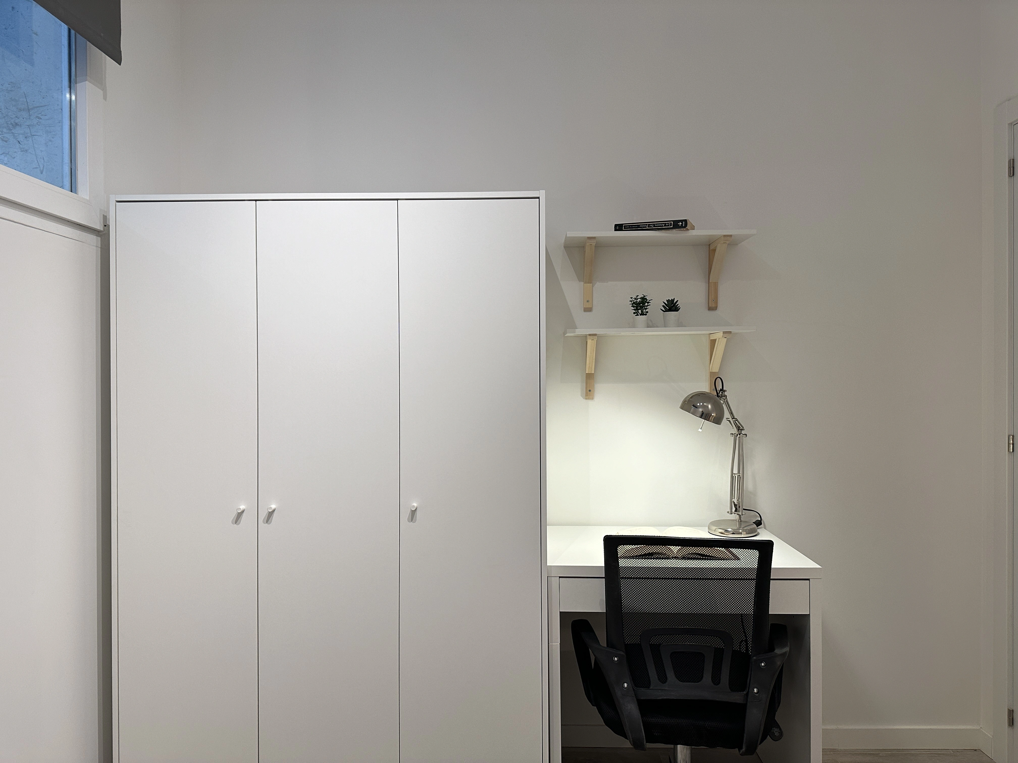Cada habitación está diseñada pensando en las necesidades de los estudiantes, equipadas con una cama, una zona de estudio (escritorio y silla) y un armario.
