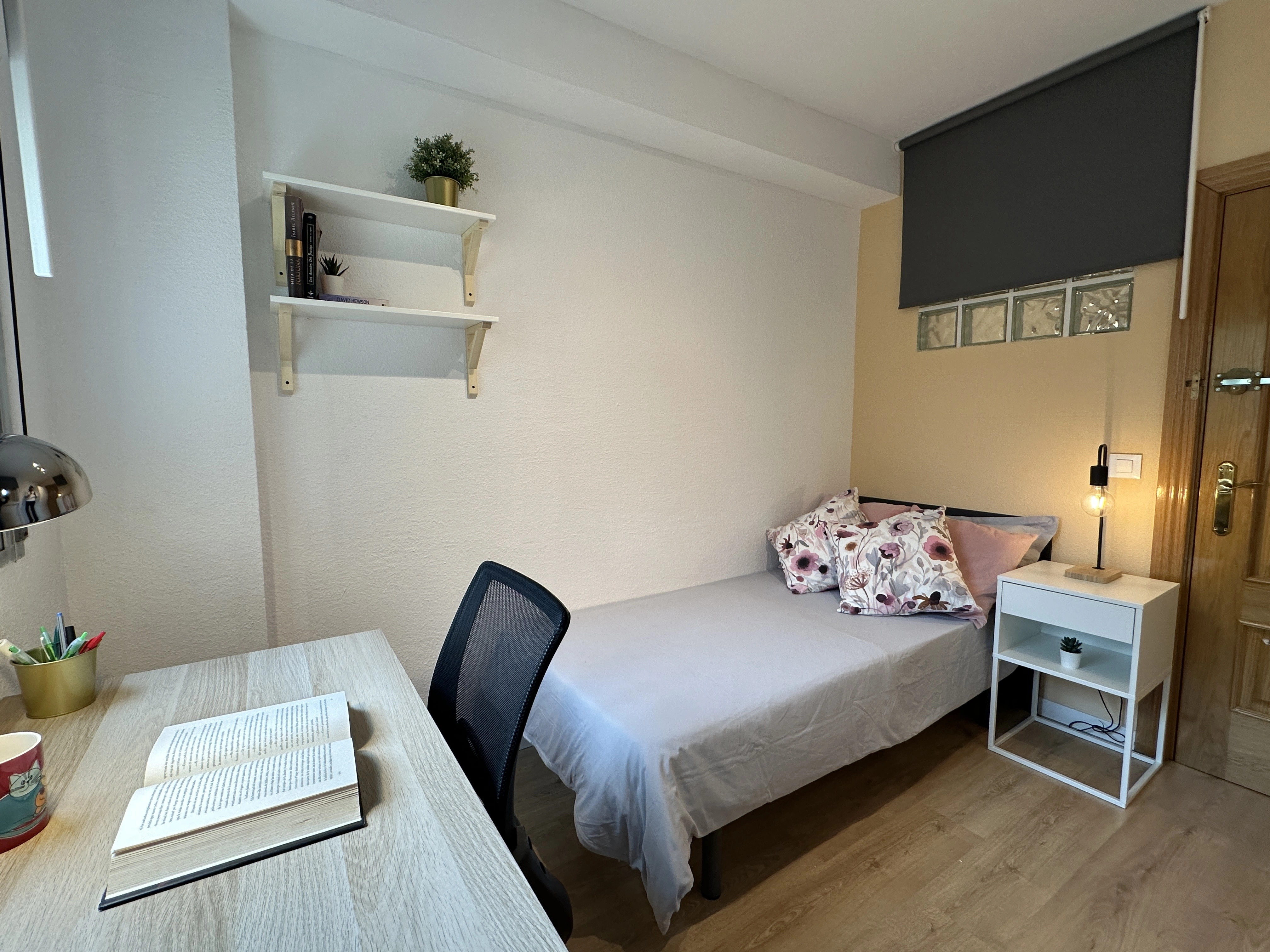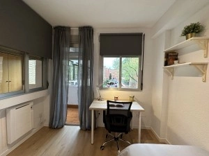 Este dormitorio es perfecto para los estudiantes que vienen a Madrid a estudiar en la escuela. La cama ofrece un lugar acogedor para descansar después de un largo día de clases. Con múltiples ventanas que permiten que la luz del sol inunde la habitación, se crea un espacio productivo para condiciones óptimas de estudio. Las ventanas ofrecen una bonita vista de la calle. Además, tiene un balcón espacioso, creando un lugar ideal para relajarse y tomar un poco de aire fresco. El armario y los estantes proporcionan mucho espacio de almacenamiento para cualquier artículo que pueda necesitar.