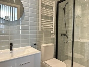 El baño tiene un diseño moderno, con una ducha de vidrio y azulejos elegantes, creando un espacio limpio y práctico para el uso diario.