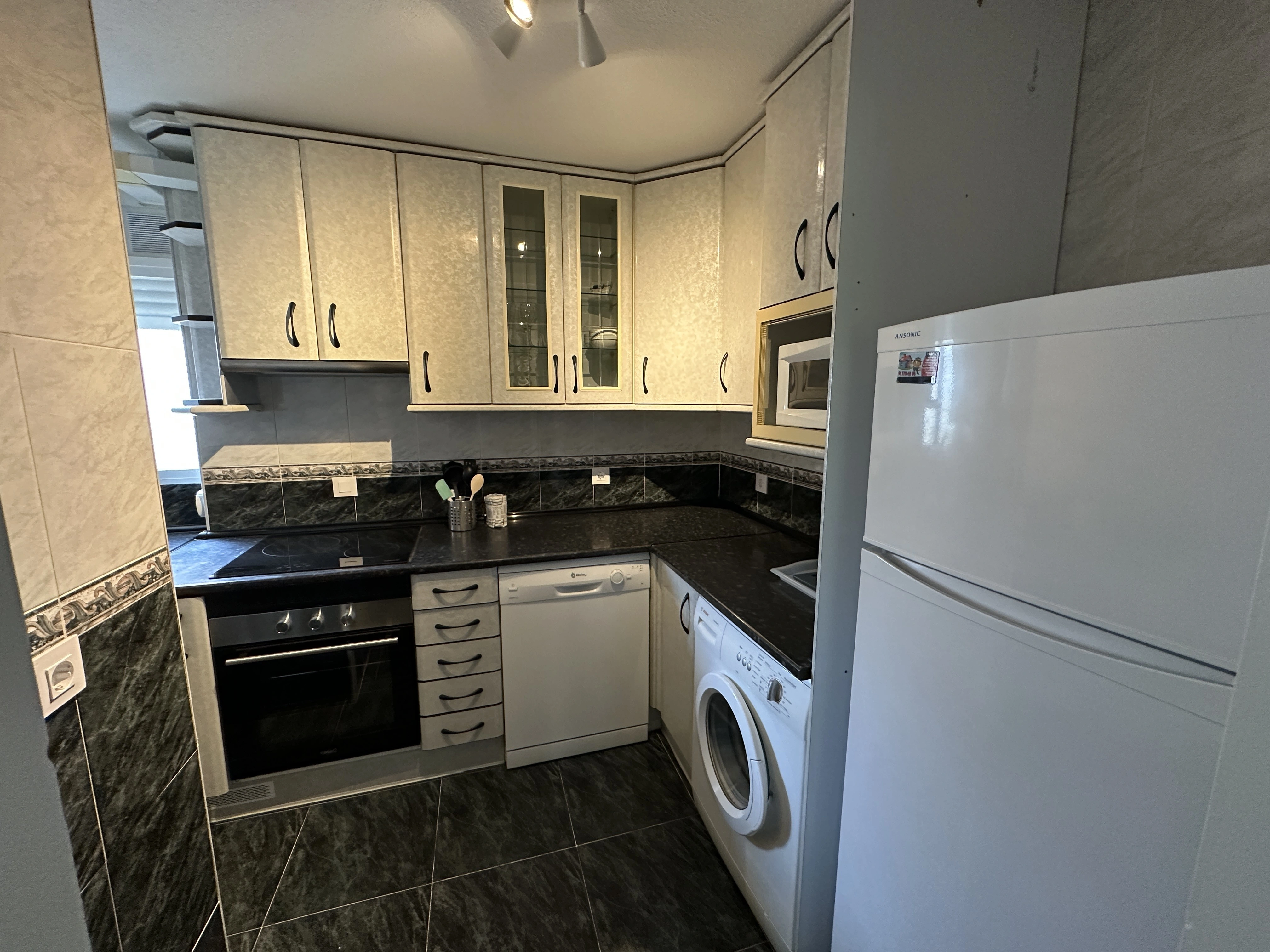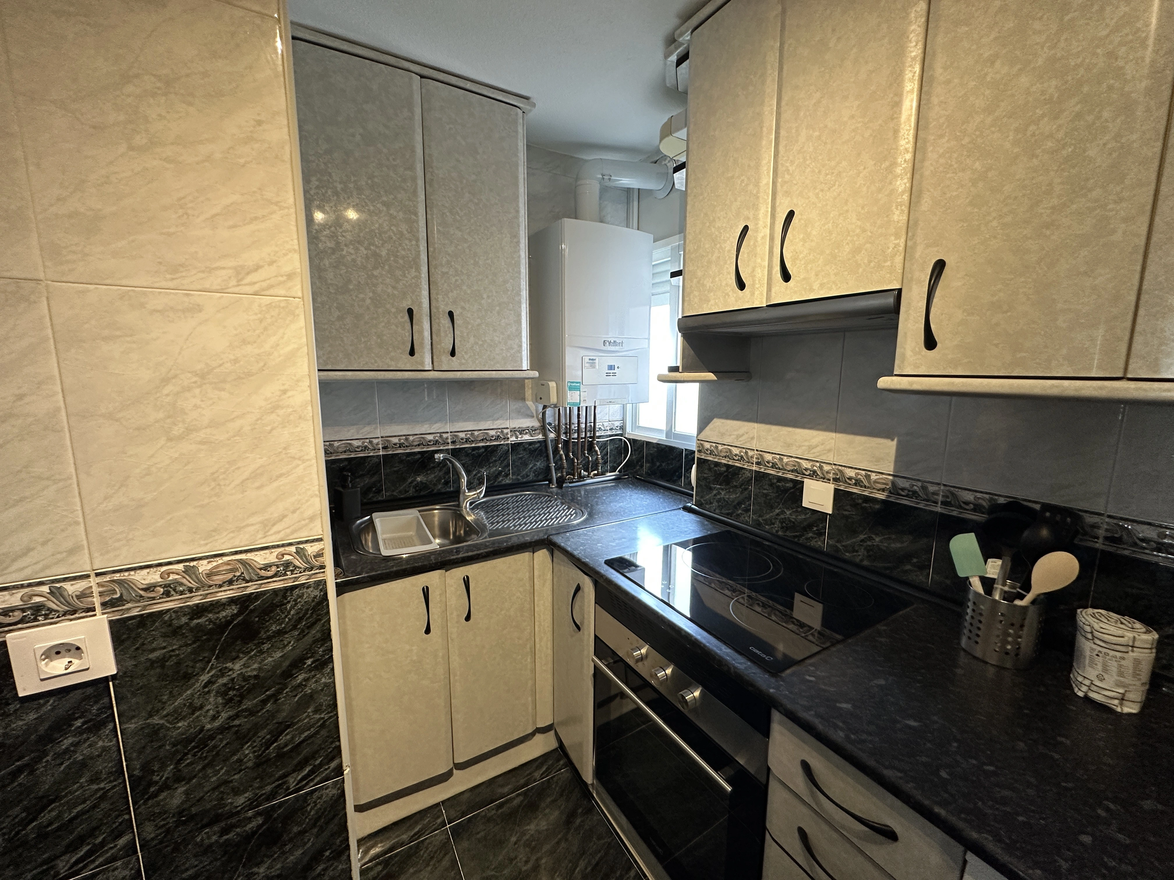 La cocina está completamente equipada con nevera, horno, lavadora, microondas, lavavajillas, vitrocerámica y muebles funcionales para un almacenamiento organizado. El salón-comedor es amplio y luminoso, cuenta con un cómodo sofá, televisor y una mesa con cuatro sillas, perfecta para estudiar o comer en grupo. Además, el salón dispone de un balcón privado, ideal para disfrutar del aire fresco y la luz natural, un valor añadido para relajarse o leer al aire libre.