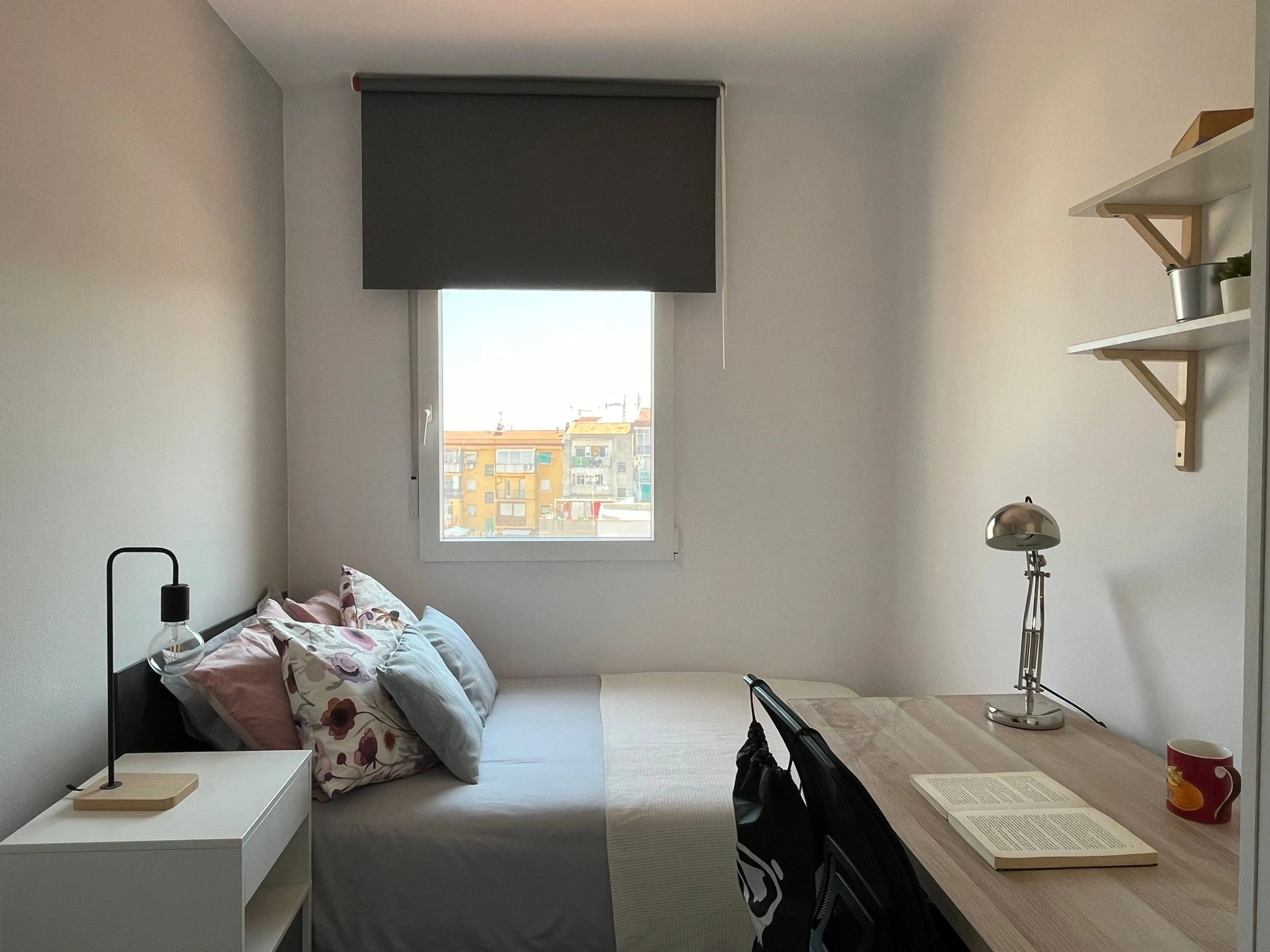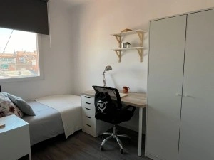 Este apartamento, recién renovado, es ideal para estudiantes que buscan un espacio moderno y funcional. Cuenta con dos habitaciones, una con una cama de 135 cm y la otra con una cama de 105 cm, ambas equipadas con escritorio y armario, perfectas para el estudio y el descanso. El salón-comedor es amplio y cómodo, y está equipado con un sofá, televisión, mesa de centro, mesa de comedor para cuatro personas y aire acondicionado, lo que garantiza una estancia agradable.