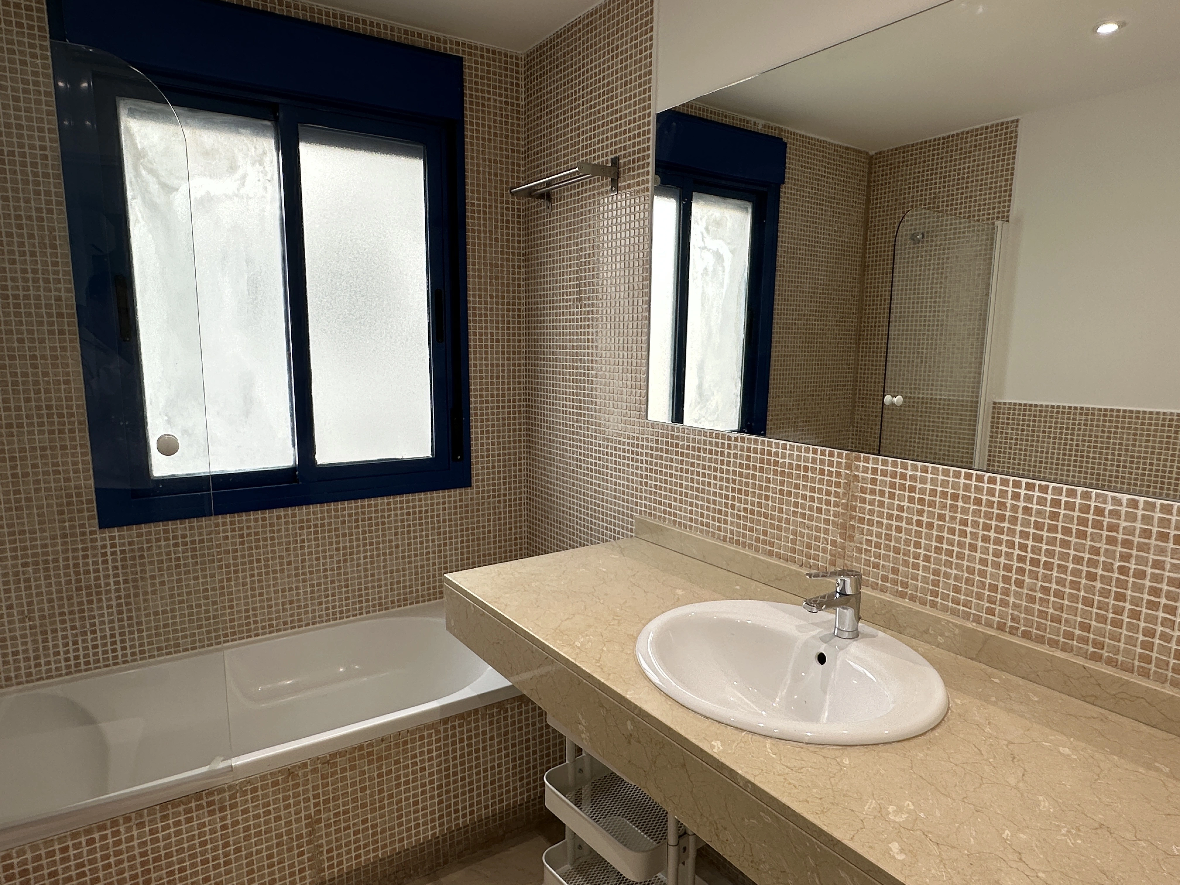 El piso cuenta con un baño completo, equipado con inodoro, lavabo y bañera, ideal para relajarse después de un día de clases.