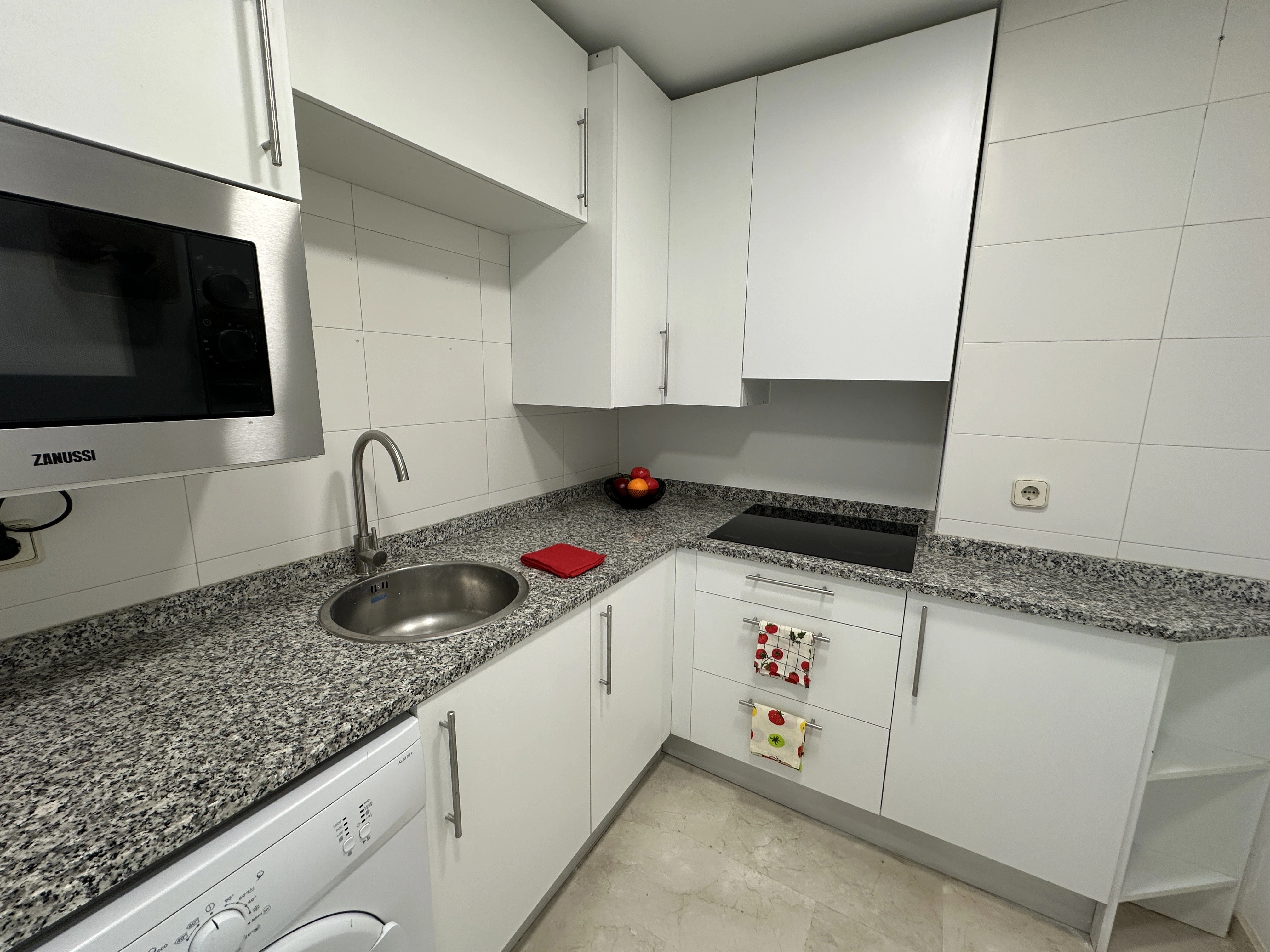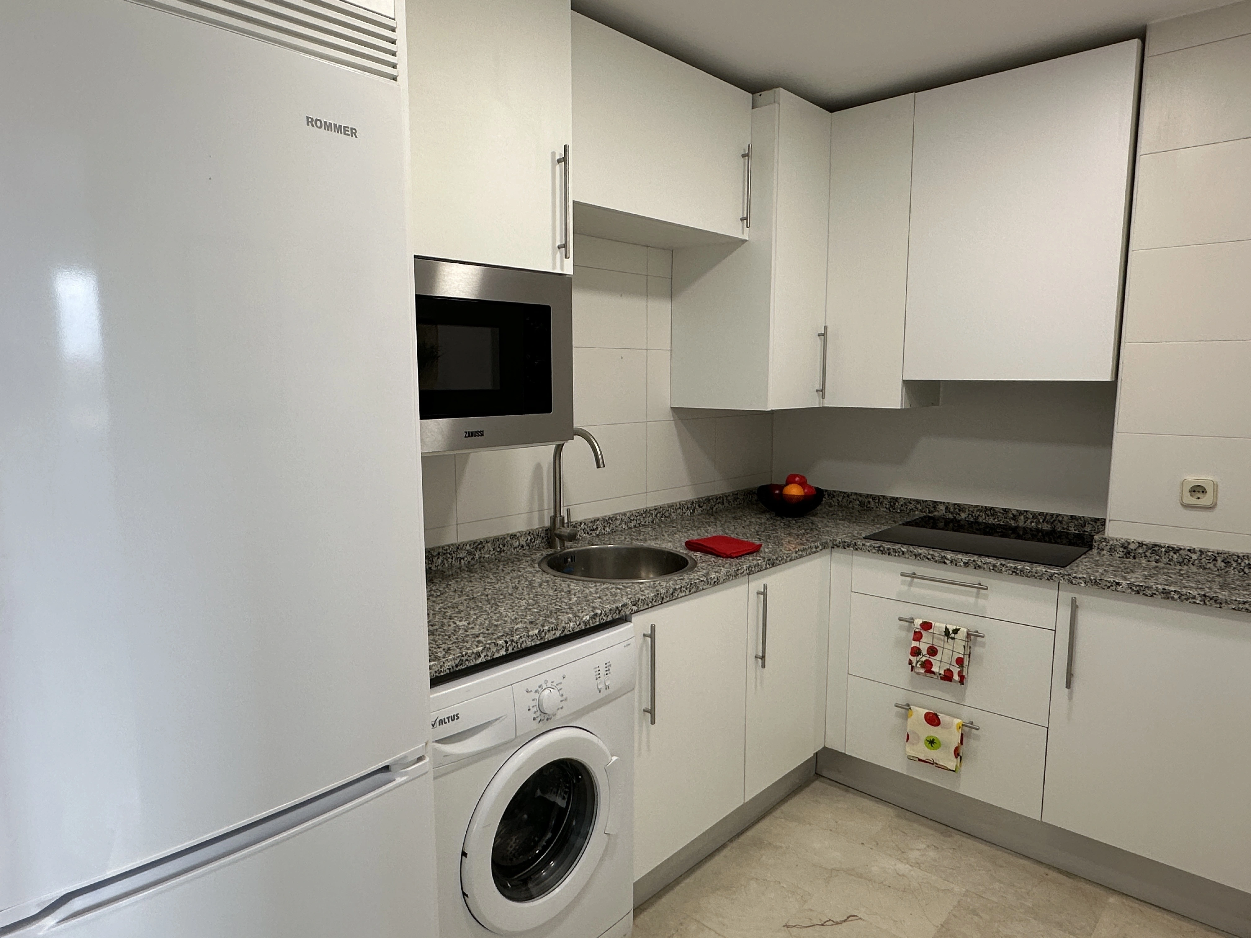 La cocina está completamente equipada con nevera, horno, microondas, lavadora y todos los utensilios necesarios para entrar a vivir, ofreciendo total funcionalidad desde el primer día.