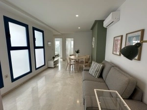 Al entrar, encontrarás un recibidor que da la bienvenida y conecta con el resto de las estancias. El salón exterior destaca por sus grandes ventanales, que permiten la entrada de mucha luz natural, creando un ambiente agradable y espacioso. Está amueblado con un cómodo sofá, aire acondicionado y una mesa de comedor con cuatro sillas, perfecta para estudiar o compartir comidas. (Este salón no dispone de televisor.)