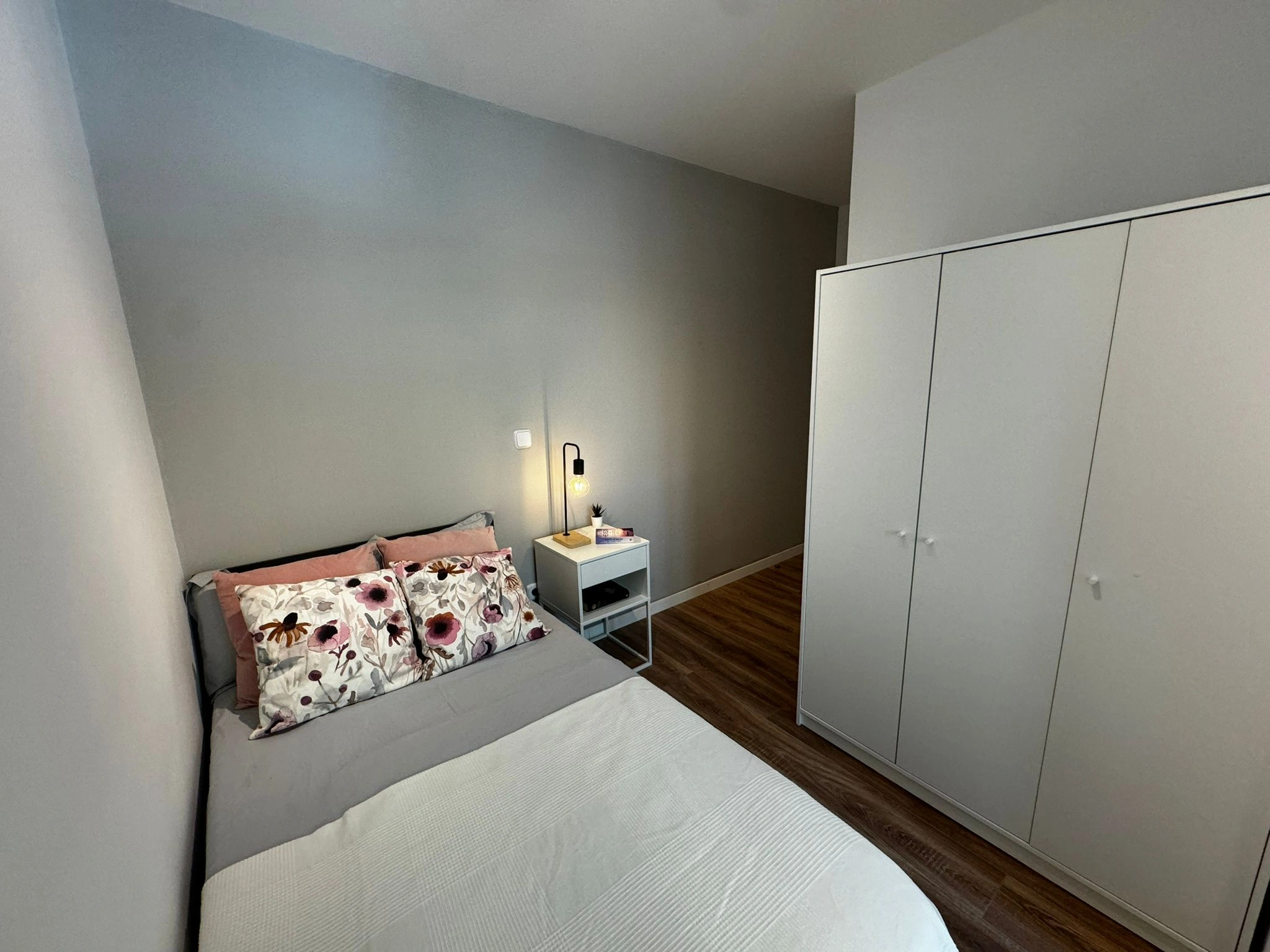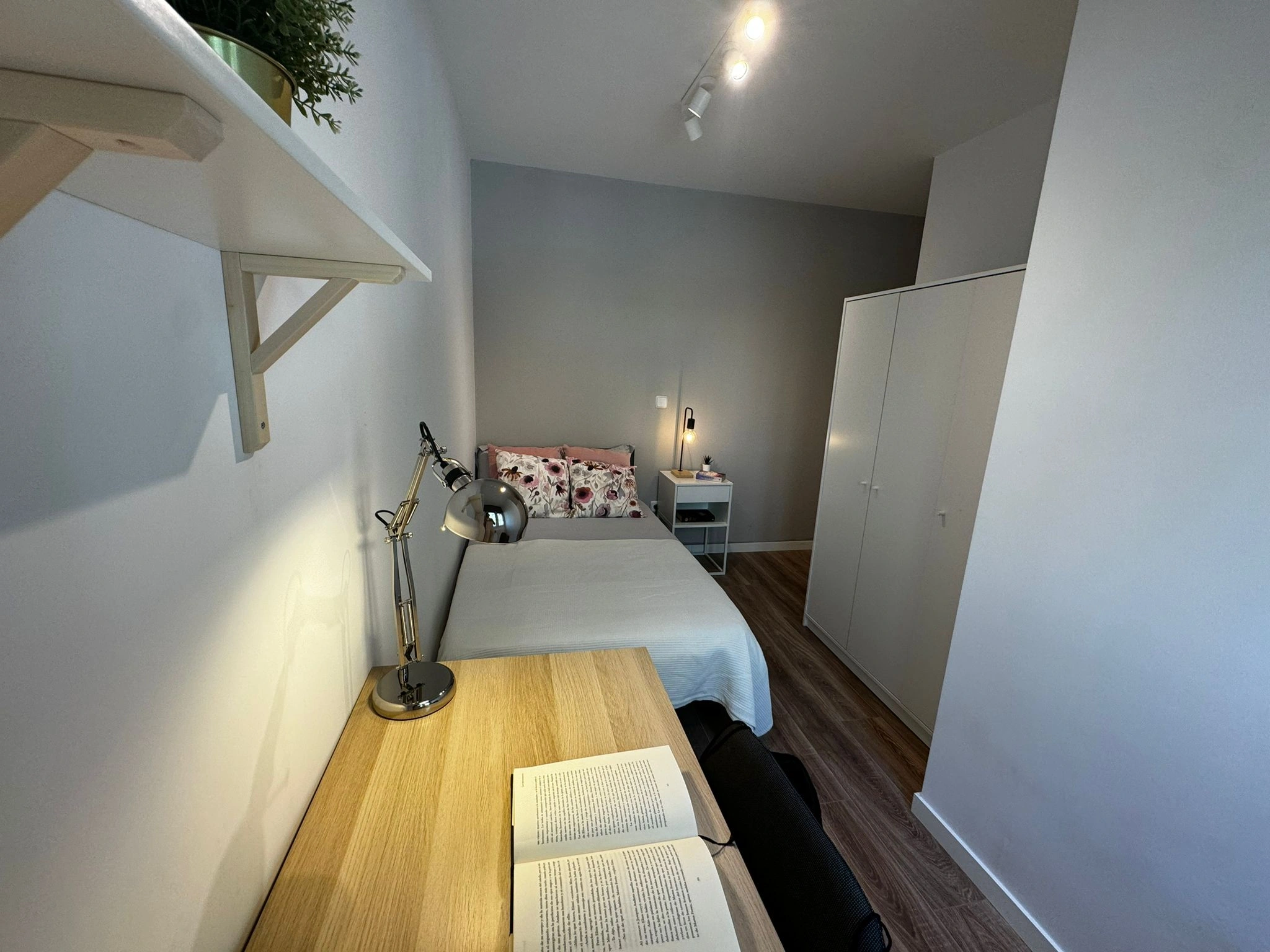 El apartamento también cuenta con un amplio salón-comedor, perfecto para compartir momentos con tus compañeros, y una cocina integrada en la misma estancia, situada en un pasillo para optimizar el espacio y facilitar la convivencia. Es una opción perfecta para estudiantes que valoran tanto la privacidad como la socialización en un entorno cómodo y funcional.